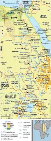 The Nile River system is the dominant physical feature, and all streams and rivers of Sudan drain either into or toward the Nile. It enters the country as the White Nile (Baḥr Al-Abyaḍ) in the southeast, about 60 miles (100 km) south of Kūstī, and maintains an extremely low gradient until it is joined by the Blue Nile (Baḥr Al-Azraq) at Khartoum. The Blue Nile, which rises in the Ethiopian Plateau, contributes much of the floodwaters of the White Nile. After the confluence of the White and Blue Niles at Khartoum, the river flows in a great northward-curving course and is known simply as the Nile (Nahr Al-Nīl). Throughout much of the country, however, drainage does not reach the Nile; the rivers of the southwest infrequently reach the Baḥr Al-Ghazāl system, and to the north most hill groups initiate seasonal watercourses that are lost in the surrounding plains.